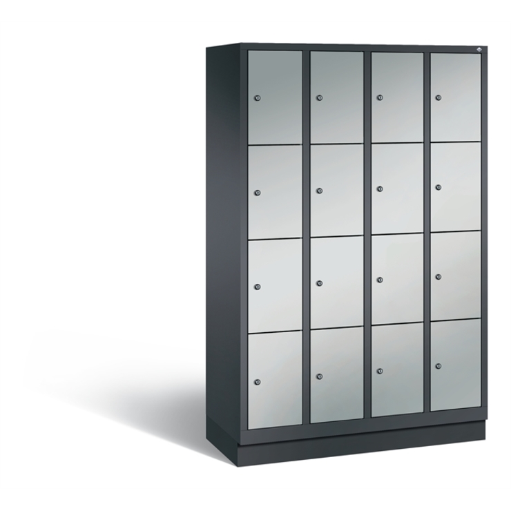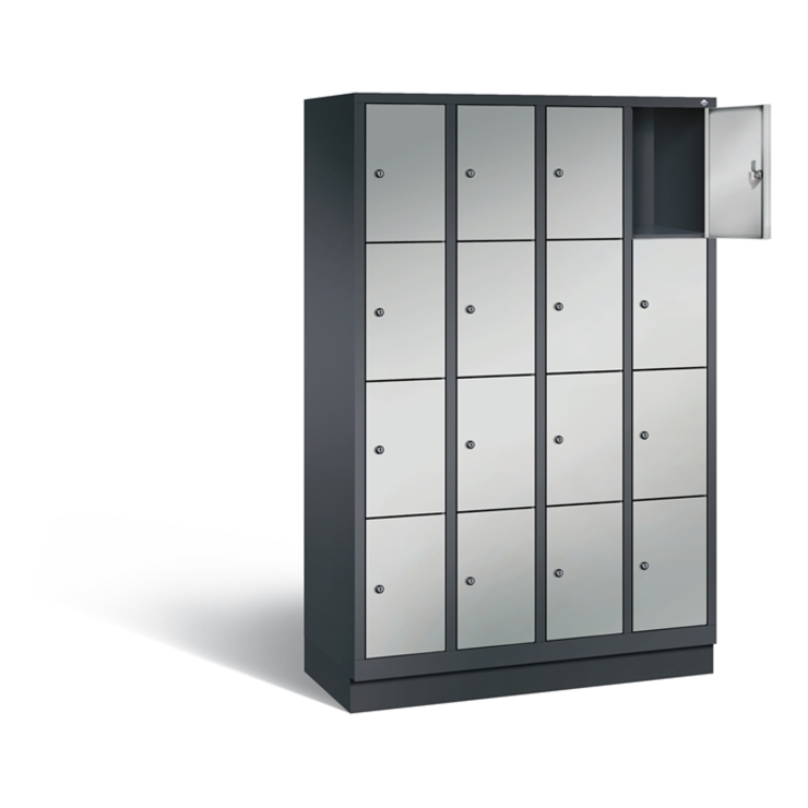 Stahl-Fächerschrank Classic, 4 Abteile mit 4 Fächern, Abteilbreite 300 mm, Korpus aus stabiler Stahlkonstruktion mit hochwertiger Einbrennbeschichtung für hohe UV- und Korrosionsbeständigkeit, auf 100 mm hohem Sockel, mit Kunststoffgleitern als praktischer Schrank- und Fußbodenschutz, vorne zurückgesetzt, 16 Zylinderschlösser mit je 2 Schlüsseln, Schließkreis bis 1000 verschiedene Schließungen, Türen mit Anschlagsdämpfer, Türaufhängung in Drehbolzen, Maße (H x B x T): 1800 x 1190 x 500 mm, Korpus: RAL 7021 Schwarzgrau, Türen Stahl: RAL 9006 Weißaluminium