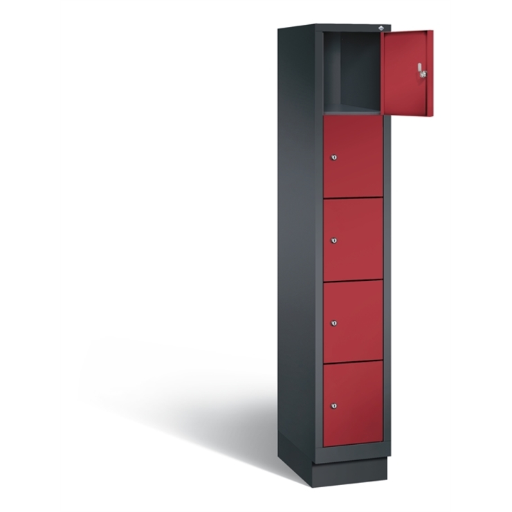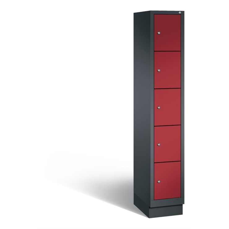 Stahl-Fächerschrank Classic, 1 Abteil mit 5 Fächern, Abteilbreite 300 mm, Korpus aus stabiler Stahlkonstruktion mit hochwertiger Einbrennbeschichtung für hohe UV- und Korrosionsbeständigkeit, auf 100 mm hohem Sockel, mit Kunststoffgleitern als praktischer Schrank- und Fußbodenschutz, vorne zurückgesetzt, 5 Zylinderschlösser mit je 2 Schlüsseln, Schließkreis bis 1000 verschiedene Schließungen, Türen mit Anschlagsdämpfer, Türaufhängung in Drehbolzen, Maße (H x B x T): 1800 x 320 x 500 mm, Korpus: RAL 7021 Schwarzgrau, Türen Stahl: RAL 3003 Rubinrot