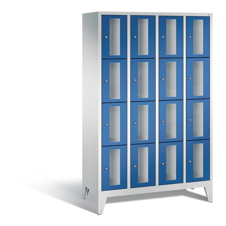 Stahl-Fächerschrank Classic, 4 Abteile mit 4 Fächern, Abteilbreite 300 mm, Korpus aus stabiler Stahlkonstruktion mit hochwertiger Einbrennbeschichtung für hohe UV- und Korrosionsbeständigkeit, auf 150 mm hohen Füßen aus Kunststoff für erweiterten Korrosionsschutz, 16 Zylinderschlösser mit je 2 Schlüsseln, Schließkreis bis 1000 verschiedene Schließungen, 1 Türen mit Sichtfenster aus Acrylglas für direkten Einblick, Türaufhängung in Drehbolzen mit Öffnungswinkel von ca. 110 Grad, inkl. Anschlagsdämpfer für angenehmes Schließverhalten, Maße (H x B x T): 1850 x 1190 x 500 mm, Korpus: RAL 7035 Lichtgrau, Türen Stahl: RAL 5010 Enzianblau, Füße: RAL 7035 Lichtgrau