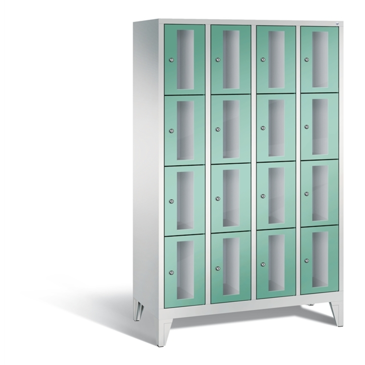 Stahl-Fächerschrank Classic, 4 Abteile mit 4 Fächern, Abteilbreite 300 mm, Korpus aus stabiler Stahlkonstruktion mit hochwertiger Einbrennbeschichtung für hohe UV- und Korrosionsbeständigkeit, auf 150 mm hohen Füßen aus Kunststoff für erweiterten Korrosionsschutz, 16 Zylinderschlösser mit je 2 Schlüsseln, Schließkreis bis 1000 verschiedene Schließungen, 1 Türen mit Sichtfenster aus Acrylglas für direkten Einblick, Türaufhängung in Drehbolzen mit Öffnungswinkel von ca. 110 Grad, inkl. Anschlagsdämpfer für angenehmes Schließverhalten, Maße (H x B x T): 1850 x 1190 x 500 mm, Korpus: RAL 7035 Lichtgrau, Türen Stahl: RAL 6027 Lichtgrün, Füße: RAL 7035 Lichtgrau