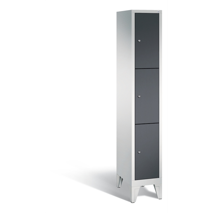 Stahl-Fächerschrank Classic, 1 Abteil mit 3 Fächern, Abteilbreite 300 mm, Korpus aus stabiler Stahlkonstruktion mit hochwertiger Einbrennbeschichtung für hohe UV- und Korrosionsbeständigkeit, auf 150 mm hohen Füßen aus Kunststoff für erweiterten Korrosionsschutz, 3 Zylinderschlösser mit je 2 Schlüsseln, Schließkreis bis 1000 verschiedene Schließungen, Türen mit Anschlagsdämpfer, Türaufhängung in Drehbolzen, Maße (H x B x T): 1850 x 320 x 500 mm, Korpus: RAL 7035 Lichtgrau, Türen Stahl: RAL 7021 Schwarzgrau, Füße: RAL 7035 Lichtgrau