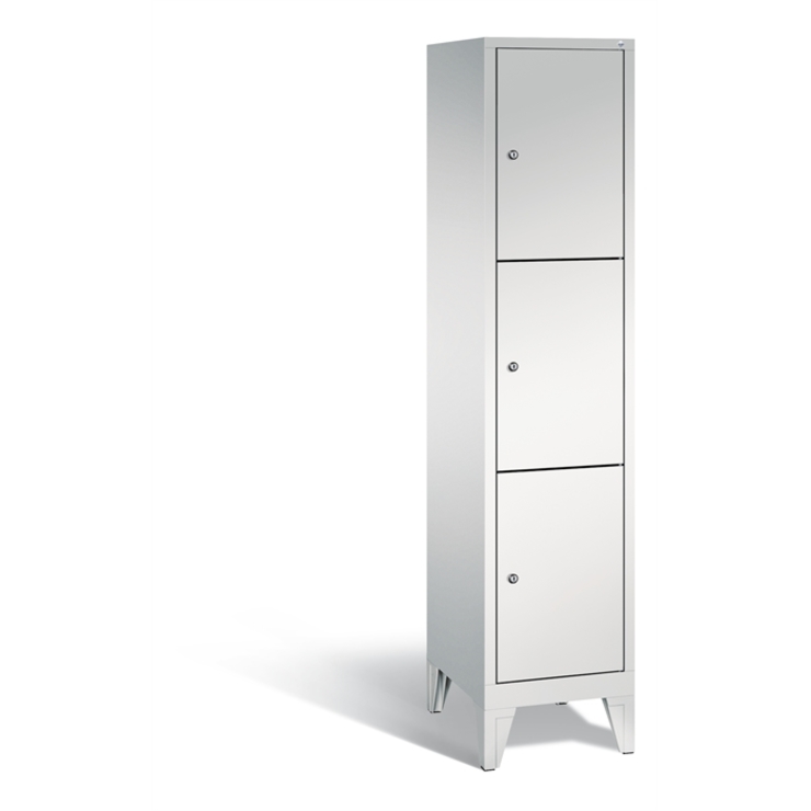 Stahl-Fächerschrank Classic, 1 Abteil mit 3 Fächern, Abteilbreite 400 mm, Korpus aus stabiler Stahlkonstruktion mit hochwertiger Einbrennbeschichtung für hohe UV- und Korrosionsbeständigkeit, auf 150 mm hohen Füßen aus Kunststoff für erweiterten Korrosionsschutz, 3 Zylinderschlösser mit je 2 Schlüsseln, Schließkreis bis 1000 verschiedene Schließungen, Türen mit Anschlagsdämpfer, Türaufhängung in Drehbolzen, Maße (H x B x T): 1850 x 420 x 500 mm, Korpus: RAL 7035 Lichtgrau, Türen Stahl: RAL 7035 Lichtgrau, Füße: RAL 7035 Lichtgrau