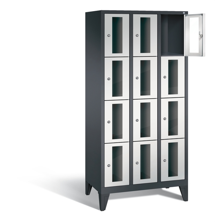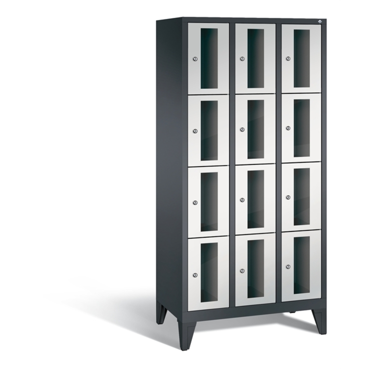 Stahl-Fächerschrank Classic, 3 Abteile mit 4 Fächern, Abteilbreite 300 mm, Korpus aus stabiler Stahlkonstruktion mit hochwertiger Einbrennbeschichtung für hohe UV- und Korrosionsbeständigkeit, auf 150 mm hohen Füßen aus Kunststoff für erweiterten Korrosionsschutz, 12 Zylinderschlösser mit je 2 Schlüsseln, Schließkreis bis 1000 verschiedene Schließungen, 1 Türen mit Sichtfenster aus Acrylglas für direkten Einblick, Türaufhängung in Drehbolzen mit Öffnungswinkel von ca. 110 Grad, inkl. Anschlagsdämpfer für angenehmes Schließverhalten, Maße (H x B x T): 1850 x 900 x 500 mm, Korpus: RAL 7021 Schwarzgrau, Türen Stahl: RAL 7035 Lichtgrau, Füße: RAL 9005 Tiefschwarz