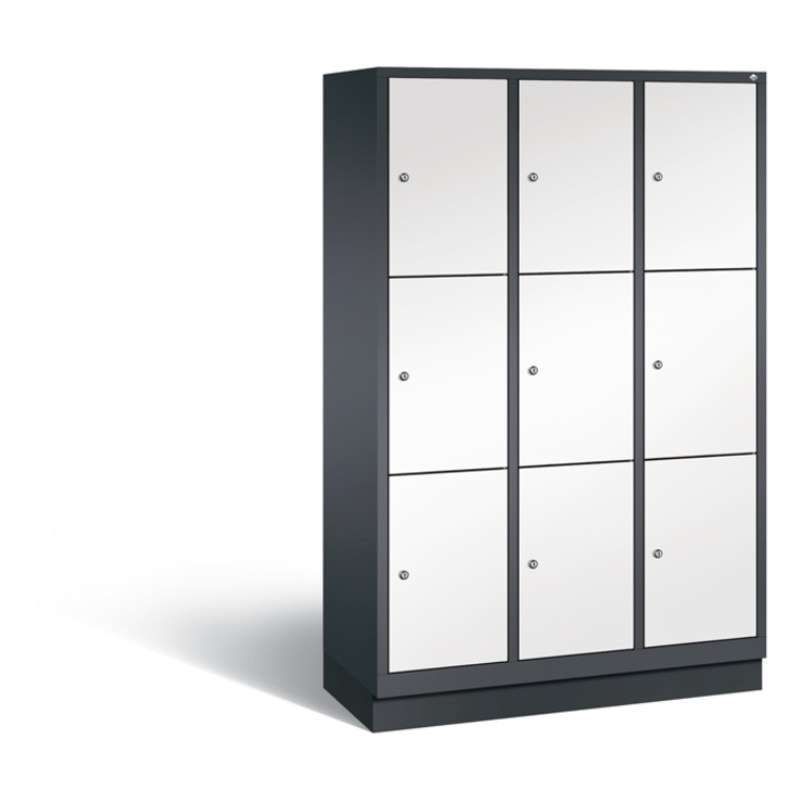 Stahl-Fächerschrank Evolo, 3 Abteile mit je 3 Fächern, Abteilbreite 400 mm, Korpus aus stabiler Stahlkonstruktion mit hochwertiger Einbrennbeschichtung für hohe UV- und Korrosionsbeständigkeit, auf 100 mm hohem Sockel, mit Kunststoffgleitern als praktischer Schrank- und Fußbodenschutz, vorne zurückgesetzt, 9 Zylinderschlösser mit je 2 Schlüsseln, Schließkreis bis 1000 verschiedene Schließungen, Türen mit Anschlagsdämpfer, Türaufhängung in Drehbolzen, Maße (H x B x T): 1800 x 1200 x 500 mm, Korpus: RAL 7021 Schwarzgrau, Türen Stahl: RAL 9016 Verkehrsweiß
