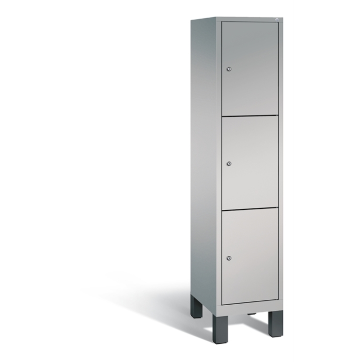 Stahl-Fächerschrank Evolo, 1 Abteil mit 3 Fächern, Abteilbreite 400 mm, Korpus aus stabiler Stahlkonstruktion mit hochwertiger Einbrennbeschichtung für hohe UV- und Korrosionsbeständigkeit, auf 150 mm hohen Füßen aus Kunststoff für erweiterten Korrosionsschutz, mit integrierter Niveauregulierung und Schutzhülsen zur stilvollen Abdeckung der Verstellschrauben, bequem von innen und außen verstellbar, 3 Zylinderschlösser mit je 2 Schlüsseln, Schließkreis bis 1000 verschiedene Schließungen, Türen mit Anschlagsdämpfer, Türaufhängung in Drehbolzen, Maße (H x B x T): 1850 x 420 x 500 mm, Korpus: RAL 9006 Weißaluminium, Türen Stahl: RAL 9006 Weißaluminium, Füße: RAL 9005 Tiefschwarz