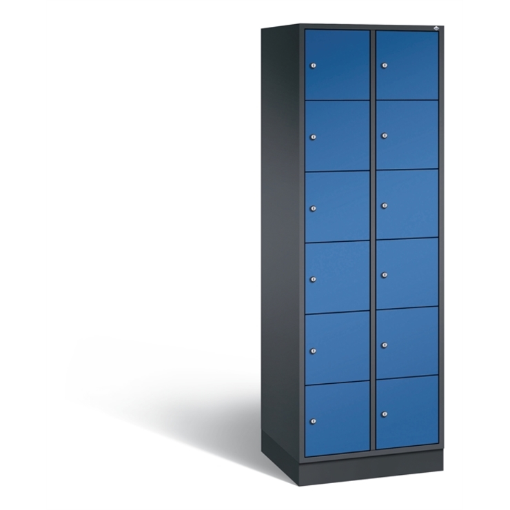 Stahl-Schließfachschrank Intro, 2 Abteile mit 6 Fächern, Abteilbreite 300 mm, Korpus aus stabiler Stahlkonstruktion mit hochwertiger Einbrennbeschichtung für hohe UV- und Korrosionsbeständigkeit, Türen doppelwandig für hohe Stabilität, mit Anschlagsdämpfer, Türaufhängung durchgängig mit robustem Scharnierband, rechts angeschlagen, Rückwand mit großflächigem Luftdurchlass und 18 mm Wandabstandshaltern, auf 100 mm hohem Sockel, 12 Zylinderschlösser mit je 2 Schlüsseln, Schließkreis bis 1000 verschiedene Schließungen, Maße (H x B x T): 1950 x 620 x 490 mm, Korpus: RAL 7021 Schwarzgrau, Türen: RAL 5010 Enzianblau, Sockel: RAL 7021 Schwarzgrau