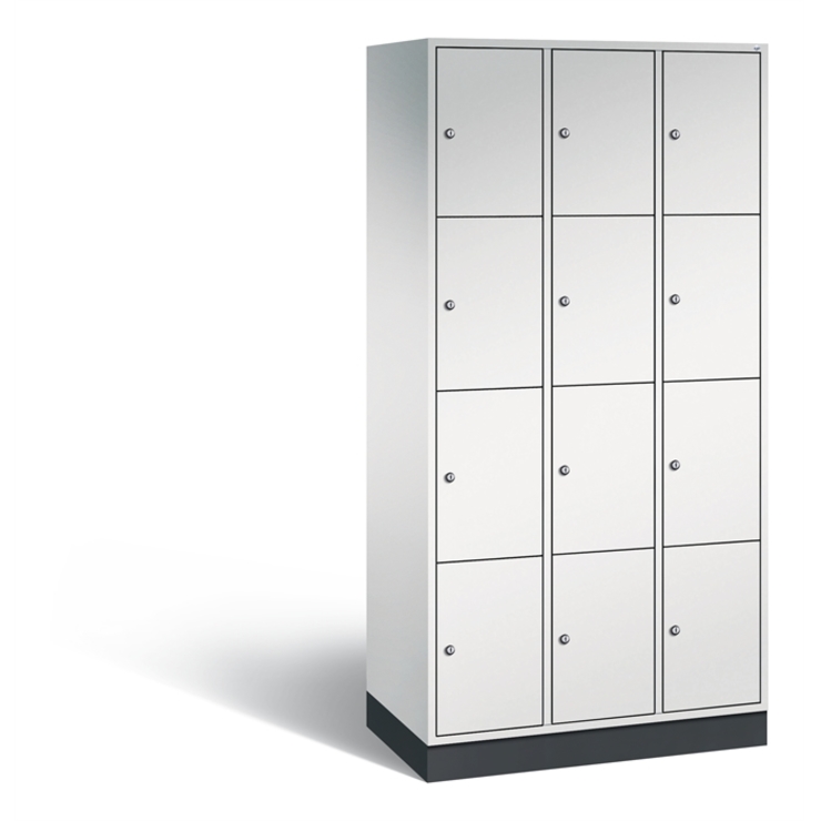 Stahl-Schließfachschrank Intro, 3 Abteile mit 4 Fächern, Abteilbreite 300 mm, Korpus aus stabiler Stahlkonstruktion mit hochwertiger Einbrennbeschichtung für hohe UV- und Korrosionsbeständigkeit, Türen doppelwandig für hohe Stabilität, mit Anschlagsdämpfer, Türaufhängung durchgängig mit robustem Scharnierband, rechts angeschlagen, Rückwand mit großflächigem Luftdurchlass und 18 mm Wandabstandshaltern, auf 100 mm hohem Sockel, 12 Zylinderschlösser mit je 2 Schlüsseln, Schließkreis bis 1000 verschiedene Schließungen, Maße (H x B x T): 1950 x 920 x 490 mm, Korpus: RAL 7035 Lichtgrau, Türen: RAL 7035 Lichtgrau, Sockel: RAL 7021 Schwarzgrau
