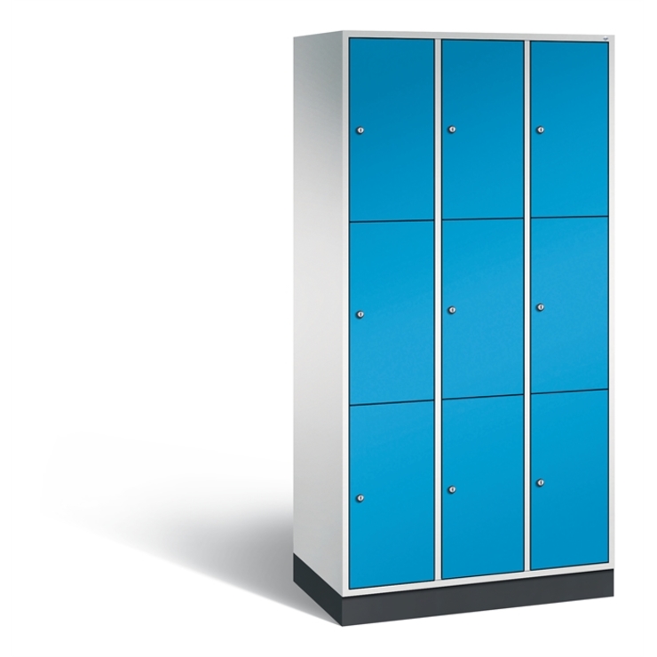Stahl-Schließfachschrank Intro, 3 Abteile mit 3 Fächern, Abteilbreite 300 mm, Korpus aus stabiler Stahlkonstruktion mit hochwertiger Einbrennbeschichtung für hohe UV- und Korrosionsbeständigkeit, Türen verstärkt für hohe Stabilität, mit Anschlagsdämpfer, Türaufhängung durchgängig mit robustem Scharnierband, rechts angeschlagen, Rückwand mit großflächigem Luftdurchlass und 18 mm Wandabstandshaltern, auf 100 mm hohem Sockel, 9 Zylinderschlösser mit je 2 Schlüsseln, Schließkreis bis 1000 verschiedene Schließungen, Maße (H x B x T): 1950 x 920 x 490 mm, Korpus: RAL 7035 Lichtgrau, Türen: RAL 5012 Lichtblau, Sockel: RAL 7021 Schwarzgrau