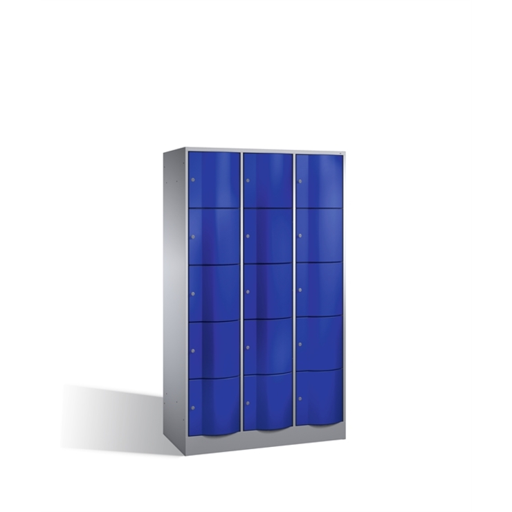Stahl-Schließfachschrank Resisto, 3 Abteile mit je 5 Fächern, Korpus aus stabiler Stahlkonstruktion mit hochwertiger Einbrennbeschichtung für hohe UV- und Korrosionsbeständigkeit, Spezialtüren aus 1,5 mm Stahl, mit Wölbung nach vorne, absolut stabil und vandalismussicher, mit Anschlagsdämpfer, Türaufhängung durchgängig mit robustem Drehstangen- Scharnier, rechts angeschlagen, Rückwand mit großflächigem Luftdurchlass und 18 mm Wandabstandshaltern, auf 100 mm hohem Sockel mit 30 mm Niveauregulierung, 15 Drehzylinderschlösser mit 2 Schlüsseln, Schließkreis bis 6000 verschiedene Schließungen, Maße (H x B x T): 1950 x 1148 x 540 mm, Korpus: RAL 9006 Weißaluminium, Türen: RAL 5010 Enzianblau
