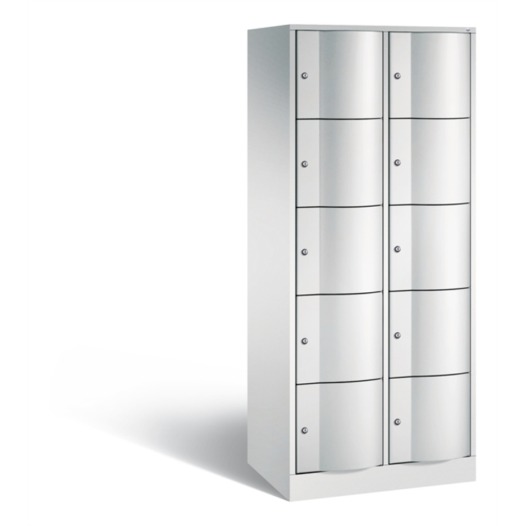 Stahl-Schließfachschrank Resisto, 2 Abteile mit je 5 Fächern, Korpus aus stabiler Stahlkonstruktion mit hochwertiger Einbrennbeschichtung für hohe UV- und Korrosionsbeständigkeit, Spezialtüren aus 1,5 mm Stahl, mit Wölbung nach vorne, absolut stabil und vandalismussicher, mit Anschlagsdämpfer, Türaufhängung durchgängig mit robustem Drehstangen- Scharnier, rechts angeschlagen, Rückwand mit großflächigem Luftdurchlass und 18 mm Wandabstandshaltern, auf 100 mm hohem Sockel mit 30 mm Niveauregulierung, 10 Drehzylinderschlösser mit 2 Schlüsseln, Schließkreis bis 6000 verschiedene Schließungen, Maße (H x B x T): 1950 x 772 x 540 mm, Korpus: RAL 7035 Lichtgrau, Türen: RAL 7035 Lichtgrau