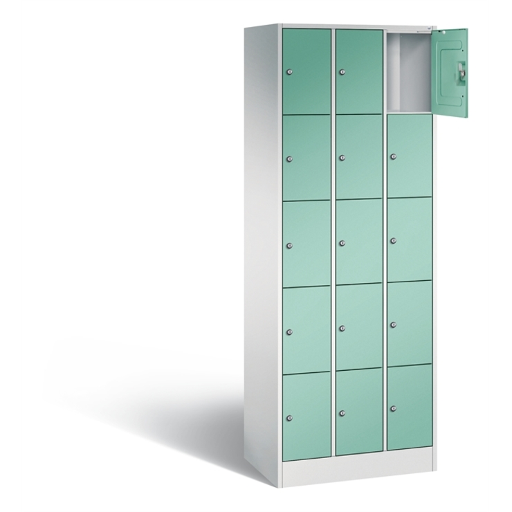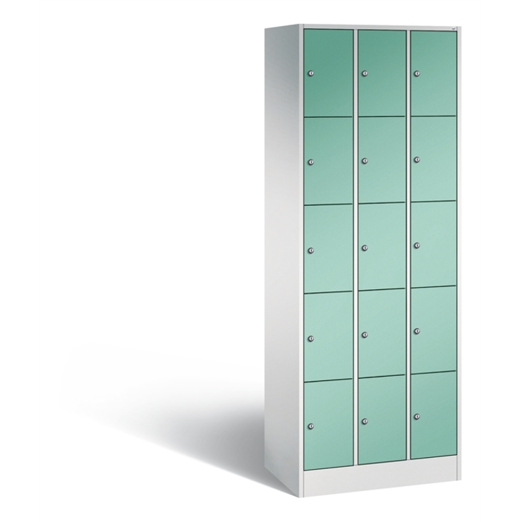 Stahl-Fächerschrank Serie 8070, 3 Abteile mit je 5 Fächern, Korpus aus stabiler Stahlkonstruktion mit hochwertiger Einbrennbeschichtung für hohe UV- und Korrosionsbeständigkeit, Türen doppelwandig für hohe Stabilität, Türaufhängung oben und unten in Drehbolzen, rechts angeschlagen, inkl. Türöffnungsbegrenzer 90 Grad, als Schutz vor Überdehnen der Tür, auf 100 mm hohem Sockel, 15 Zylinderschlösser mit je 2 Schlüsseln, Schließkreis bis 1000 verschiedene Schließungen, Maße (H x B x T): 1950 x 680 x 480 mm, Korpus: RAL 7035 Lichtgrau, Türen: RAL 6027 Lichtgrün