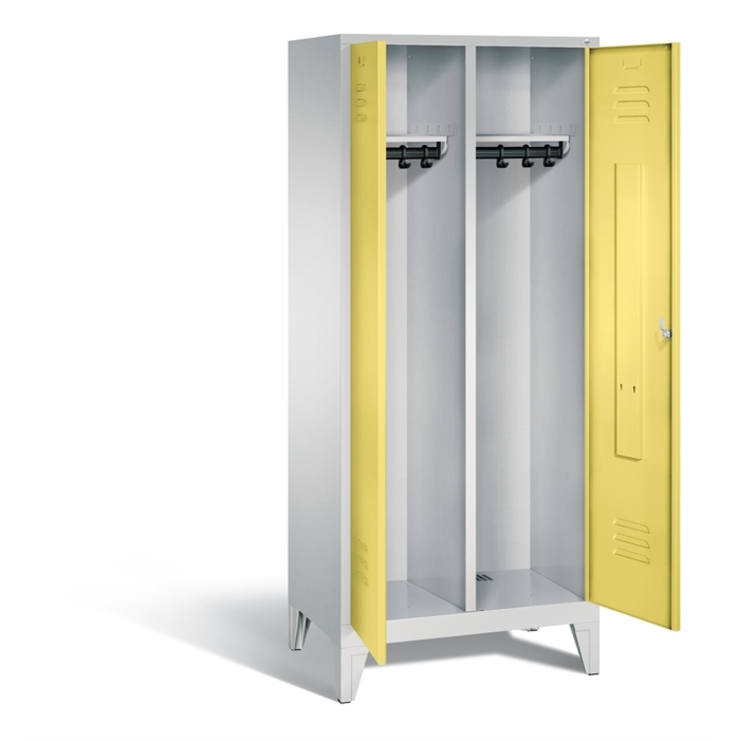 Stahl-Garderobenschrank Classic, als Straßen- und Berufskleidungsschrank 2 Abteile für 1 Person, Abteilbreite 400 mm, Türen zueinanderschlagend für gemeinsamen Verschluss, Korpus aus stabiler Stahlkonstruktion mit hochwertiger Einbrennbeschichtung für hohe UV- und Korrosionsbeständigkeit, innen je Abteil 1 Ablageboden, darunter 1 stabile Garderobenstange aus Ovalprofil mit 3 verdrehsicheren Schiebehaken, Schrankboden hinten mit Lüftungsöffnungen für optimale Luftzirkulation, auf 150 mm hohen Füßen aus Kunststoff für erweiterten Korrosionsschutz, 1 Drehriegel für Vorhangschloss, Türen mit Anschlagsdämpfer und mittiger Verstärkung für hohe Stabilität, mit Lüftungschlitzen oben und unten sowie eingestanztem Etikettenrahmen, Türaufhängung in Drehbolzen, Maße (H x B x T): 1850 x 810 x 500 mm, Korpus: RAL 7035 Lichtgrau, Türen Stahl: 0959059 RDS Schwefelgelb, Inneneinrichtung: RAL 7035 Lichtgrau, Füße: RAL 7035 Lichtgrau