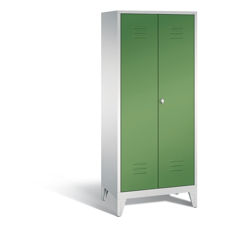 Stahl-Garderobenschrank Classic, als Straßen- und Berufskleidungsschrank 2 Abteile für 1 Person, Abteilbreite 400 mm, Türen zueinanderschlagend für gemeinsamen Verschluss, Korpus aus stabiler Stahlkonstruktion mit hochwertiger Einbrennbeschichtung für hohe UV- und Korrosionsbeständigkeit, innen je Abteil 1 Ablageboden, darunter 1 stabile Garderobenstange aus Ovalprofil mit 3 verdrehsicheren Schiebehaken, Schrankboden hinten mit Lüftungsöffnungen für optimale Luftzirkulation, auf 150 mm hohen Füßen aus Kunststoff für erweiterten Korrosionsschutz, 1 Drehriegel für Vorhangschloss, Türen mit Anschlagsdämpfer und mittiger Verstärkung für hohe Stabilität, mit Lüftungschlitzen oben und unten sowie eingestanztem Etikettenrahmen, Türaufhängung in Drehbolzen, Maße (H x B x T): 1850 x 810 x 500 mm, Korpus: RAL 7035 Lichtgrau, Türen Stahl: RAL 6011 Resedagrün, Inneneinrichtung: RAL 7035 Lichtgrau, Füße: RAL 7035 Lichtgrau