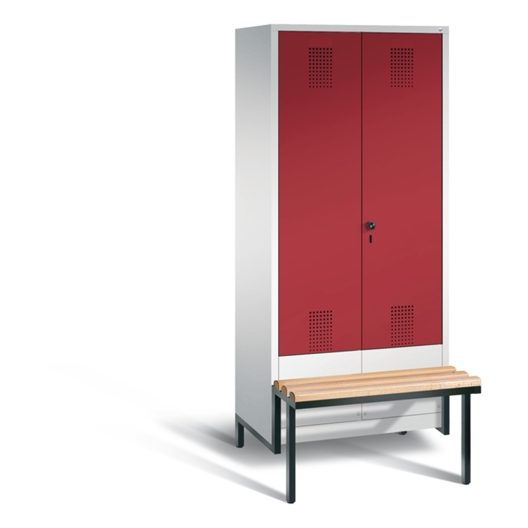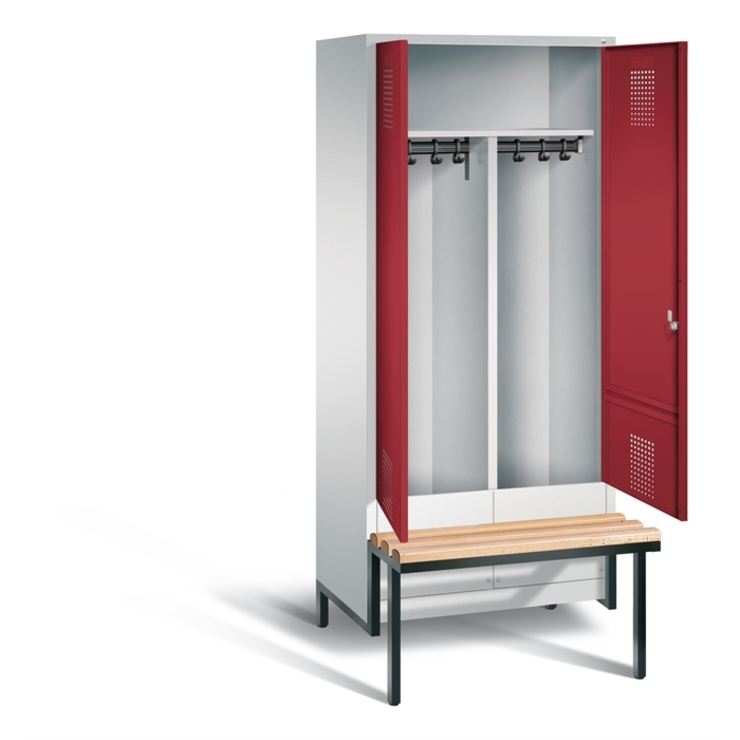 Stahl-Garderobenschrank Evolo, als Straßen- und Berufskleidungsschrank, 2 Abteile für 1 Person, Abteilbreite 300 mm, Türen zueinanderschlagend für gemeinsamen Verschluss, Korpus aus stabiler Stahlkonstruktion mit hochwertiger Einbrennbeschichtung für hohe UV- und Korrosionsbeständigkeit, innen 1 durchgehender Ablageboden, darunter je Abteil 1 stabile Garderobenstange aus Ovalprofil mit 3 verdrehsicheren Schiebehaken, Schrankboden hinten mit großflächigem Luftdurchlass für optimale... (mehr)? Papersmart hilft Ihnen, den besten Anbieter für Ihren gesamten Warenkorb zu ermitteln.