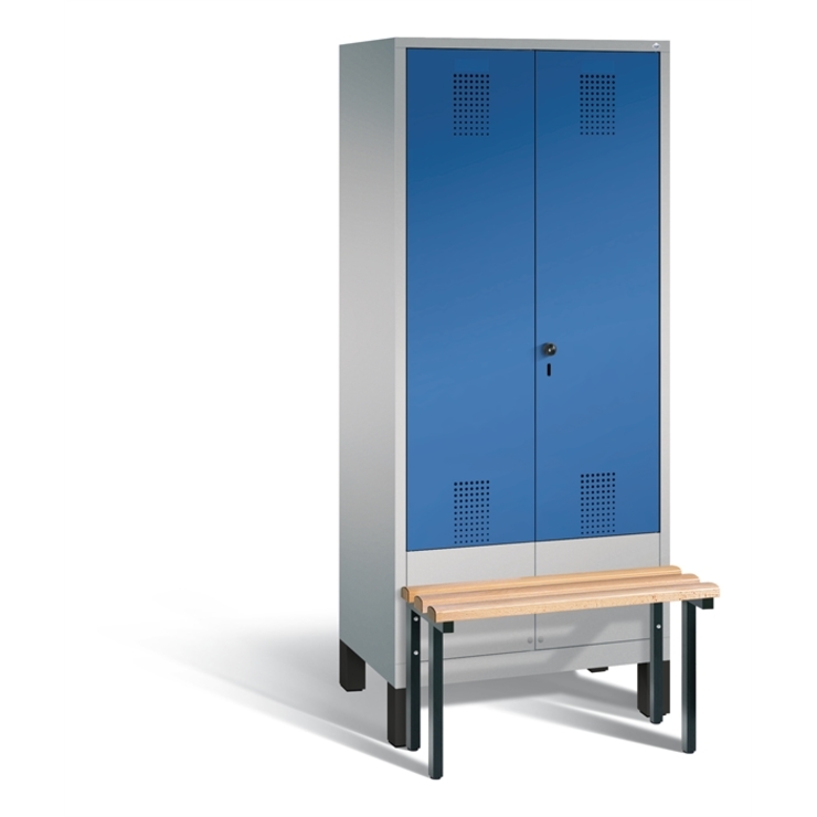 Stahl-Garderobenschrank Evolo, als Straßen- und Berufskleidungsschrank, 2 Abteile für 1 Person, Abteilbreite 300 mm, 1 Tür über 2 Abteile, rechts angeschlagen, Korpus aus stabiler Stahlkonstruktion mit hochwertiger Einbrennbeschichtung für hohe UV- und Korrosionsbeständigkeit, innen je Abteil 1 Ablageboden, darunter 1 stabile Garderobenstange aus Ovalprofil mit 3 verdrehsicheren Schiebehaken, Schrankboden hinten mit großflächigem Luftdurchlass, auf 100 mm hohem Sockel, mit... (mehr)? Papersmart hilft Ihnen, den besten Anbieter für Ihren gesamten Warenkorb zu ermitteln.