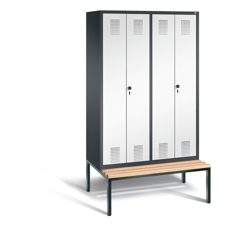 Stahl-Garderobenschrank Evolo, als Straßen- und Berufskleidungsschrank, 4 Abteile für 2 Personen, Abteilbreite 400 mm, Türen paarweise zueinanderschlagend für gemeinsamen Verschluss, Korpus aus stabiler Stahlkonstruktion mit hochwertiger Einbrennbeschichtung für hohe UV- und Korrosionsbeständigkeit, innen je Doppelabteil 1 durchgehender Ablageboden, darunter je Abteil 1 stabile Garderobenstange aus Ovalprofil mit 3 verdrehsicheren Schiebehaken, Schrankboden hinten mit großflächigem... (mehr)? Papersmart hilft Ihnen, den besten Anbieter für Ihren gesamten Warenkorb zu ermitteln.
