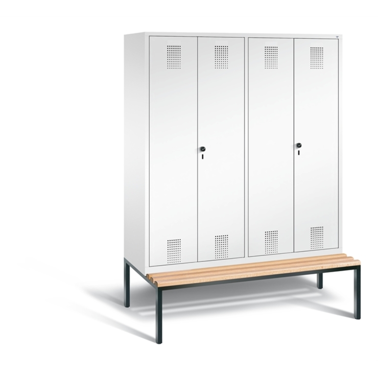 Stahl-Garderobenschrank Evolo, als Straßen- und Berufskleidungsschrank, 4 Abteile für 2 Personen, Abteilbreite 400 mm, Türen paarweise zueinanderschlagend für gemeinsamen Verschluss, Korpus aus stabiler Stahlkonstruktion mit hochwertiger Einbrennbeschichtung für hohe UV- und Korrosionsbeständigkeit, innen je Doppelabteil 1 durchgehender Ablageboden, darunter je Abteil 1 stabile Garderobenstange aus Ovalprofil mit 3 verdrehsicheren Schiebehaken, Schrankboden hinten mit großflächigem Luftdurchlass für optimale Luftzirkulation, auf untergebauter Sitzbank, Gestell aus stabilem Vierkant-Stahlrohr 30 x 30 mm, mit verstellbaren Bodengleitern für einfachen Niveauausgleich, 2 Ergonomische Sicherheits-Drehriegel für Vorhängeschlösser inkl. Tür-Schutz, Türen mit Anschlagsdämpfer und geschlossenen Seitenprofilen für höchste Stabilität und Einbruchsicherheit, mit reinigungsfreundlichem Belüftungslochbild oben und unten sowie eingeprägtem Etikettenrahmen, Türaufhängung in Drehbolzen, 1 Entfall der Füße 1 Sitzleisten aus Buche-Hartholz, im Profil ca. 60 x 30 mm, allseitig gehobelt, oben abgerundet für guten Sitzkomfort, klarlackiert mit naturgegebenen Farbunterschieden, 1 Maße (H x B x T): 2090 x 1590 x 815 mm, Korpus: RAL 9016 Verkehrsweiß, Türen Stahl: RAL 9016 Verkehrsweiß, Inneneinrichtung: RAL 7021 Schwarzgrau, Gestell: RAL 7021 Schwarzgrau