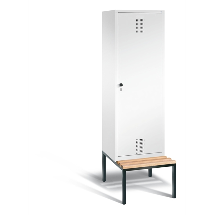 Stahl-Garderobenschrank Evolo, als Straßen- und Berufskleidungsschrank, 2 Abteile für 1 Person, Abteilbreite 300 mm, 1 Tür über 2 Abteile, rechts angeschlagen, Korpus aus stabiler Stahlkonstruktion mit hochwertiger Einbrennbeschichtung für hohe UV- und Korrosionsbeständigkeit, innen je Abteil 1 Ablageboden, darunter 1 stabile Garderobenstange aus Ovalprofil mit 3 verdrehsicheren Schiebehaken, Schrankboden hinten mit großflächigem Luftdurchlass, auf untergebauter Sitzbank, Gestell aus stabilem Vierkant-Stahlrohr 30 x 30 mm, mit verstellbaren Bodengleitern für einfachen Niveauausgleich, 1 Ergonomischer Sicherheits-Drehriegel für Vorhangschloss inkl. Tür-Schutz, Tür mit Anschlagsdämpfer und geschlossenen Seitenprofilen für höchste Stabilität und Einbruchsicherheit, mit reinigungsfreundlichem Belüftungslochbild oben und unten sowie eingeprägtem Etikettenrahmen, Türaufhängung in Drehbolzen, 1 Entfall der Füße 1 Sitzleisten aus Buche-Hartholz, im Profil ca. 60 x 30 mm, allseitig gehobelt, oben abgerundet für guten Sitzkomfort, klarlackiert mit naturgegebenen Farbunterschieden, 1 Maße (H x B x T): 2090 x 610 x 500 mm, Korpus: RAL 9016 Verkehrsweiß, Türen Stahl: RAL 9016 Verkehrsweiß, Inneneinrichtung: RAL 7021 Schwarzgrau, Gestell: RAL 7021 Schwarzgrau