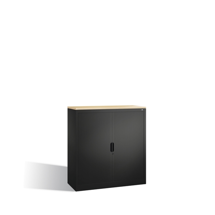 Stahl-Rollladenschrank Omnispace, als Sideboard, Korpus aus stabiler Stahlkonstruktion mit hochwertiger Einbrennbeschichtung für hohe UV-Beständigkeit, mit Kunststoffgleitern als praktischer Schrank- und Fußbodenschutz, hohe Flexibilität der Inneneinrichtung durch Höhenverstellbarkeit im 15 mm Raster, Türen aus durchgehenden, flexiblen Kunststoff- Lamellen (Polypropylen) in Leichtlaufschienen, mit Aluminiumschlossleiste und praktischer Griffmulde für einfache Bedienung, 1 integrierte Niveauregulierung bis 10 mm, bequem von innen justierbar, 1 Drehzylinderschloss mit 2 Schlüsseln, 2 Einlegeböden aus Stahl lackiert, mit hoher Traglast 50 kg, 1 25 mm Abdeckplatte aus direktbeschichteter Spanplatte (DBS) Maße (H x B x T): 1230 x 1200 x 420 mm, Korpus: RAL 7021 Schwarzgrau, Rollladen: RAL 7021 Schwarzgrau, Inneneinrichtung: RAL 7021 Schwarzgrau, Abdeckplatte DBS: Dekor Ahorn