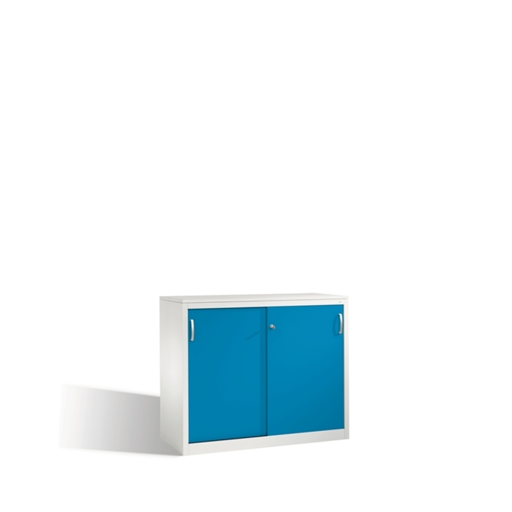 Stahl-Schiebetürenschrank Acurado-2000, als Sideboard, Korpus aus stabiler Stahlkonstruktion mit hochwertiger Einbrennbeschichtung für hohe UV-Beständigkeit, mit Kunststoffgleitern als praktischer Schrank- und Fußbodenschutz, hohe Flexibilität der Inneneinrichtung durch Höhenverstellbarkeit im 15 mm Raster, Türen verstärkt für hohe Stabilität, leichtgängige Bedienung durch Leichtlaufrollen in spezieller Schienenführung, 1 Wechselzylinder matt vernickelt mit 2 Schlüsseln, 2 Ergonomische Bügelgriffe Ergolock aus Metall für einfache Bedienung, matt vernickelt, 2 Einlegeböden aus Stahl, lackiert, mit hoher Traglast 70 kg, 1 Abdeckplatte 25 mm aus direktbeschichteter Spanplatte (DBS), Maße (H x B x T): 1000 x 1200 x 500 mm, Korpus: RAL 7035 Lichtgrau, Türen: RAL 5012 Lichtblau, Inneneinrichtung: RAL 7035 Lichtgrau, Abdeckplatte DBS: Dekor Hellgrau