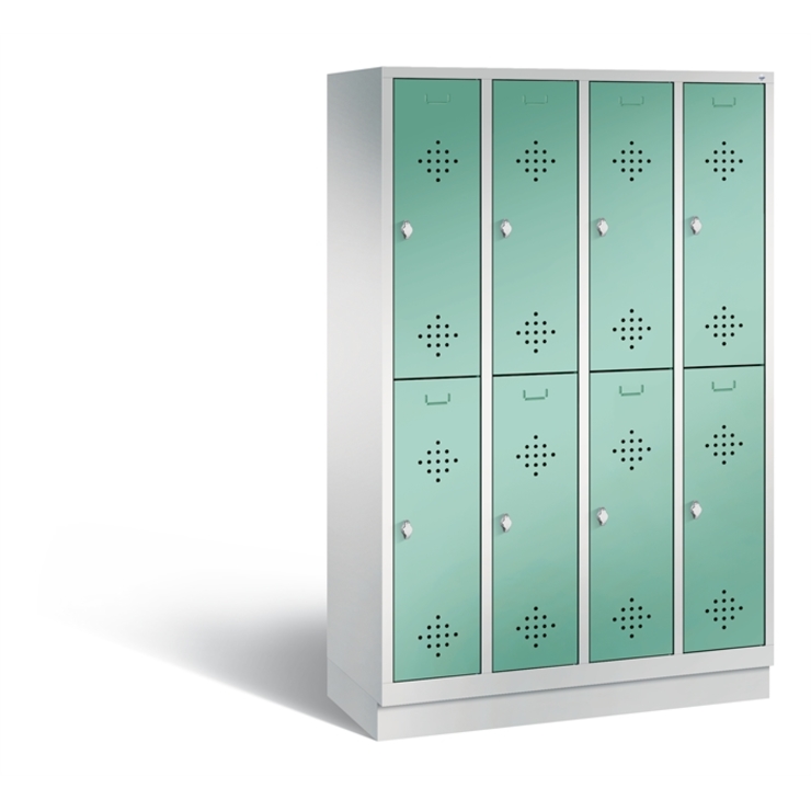 Doppelstöckiger Stahl-Garderobenschrank Classic, 4 Abteile mit 2 Fächern, Abteilbreite 300 mm, Korpus aus stabiler Stahlkonstruktion mit hochwertiger Einbrennbeschichtung für hohe UV- und Korrosionsbeständigkeit, innen je Fach 1 stabile Garderobenstange aus Ovalprofil mit 3 verdrehsicheren Schiebehaken, auf 100 mm hohem Sockel, mit Kunststoffgleitern als praktischer Schrank- und Fußbodenschutz, vorne zurückgesetzt, 8 Drehriegel für Vorhängeschlösser, 8 Türen mit Anschlagsdämpfer und mittiger Verstärkung für hohe Stabilität, mit reinigungsfreundlichem Belüftungslochbild oben und unten sowie eingeprägtem Etikettenrahmen, Türaufhängung in Drehbolzen, Maße (H x B x T): 1800 x 1190 x 500 mm, Korpus: RAL 7035 Lichtgrau, Türen Stahl: RAL 6027 Lichtgrün