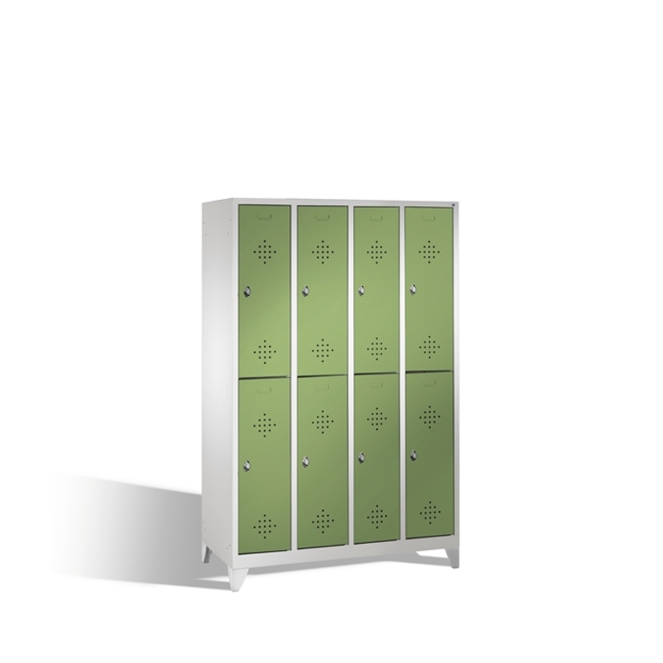 Doppelstöckiger Stahl-Garderobenschrank Classic, 4 Abteile mit je 2 Fächern, Abteilbreite 300 mm, Korpus aus stabiler Stahlkonstruktion mit hochwertiger Einbrennbeschichtung für hohe UV- und Korrosionsbeständigkeit, innen je Fach 1 stabile Garderobenstange aus Ovalprofil mit 3 verdrehsicheren Schiebehaken, auf 150 mm hohen Füßen, aus Kunststoff für optimalen Korrosionsschutz, 8 Drehriegel für Vorhängeschlösser, 8 Türen mit Anschlagsdämpfer und mittiger Verstärkung für hohe Stabilität, mit reinigungsfreundlichem Belüftungslochbild oben und unten sowie eingeprägtem Etikettenrahmen, Türaufhängung in Drehbolzen, Maße (H x B x T): 1850 x 1190 x 500 mm, Korpus: RAL 7035 Lichtgrau, Türen Stahl: RAL 1013 Perlweiß, Füße: RAL 7035 Lichtgrau