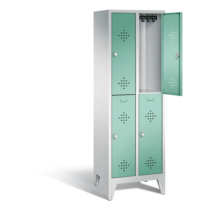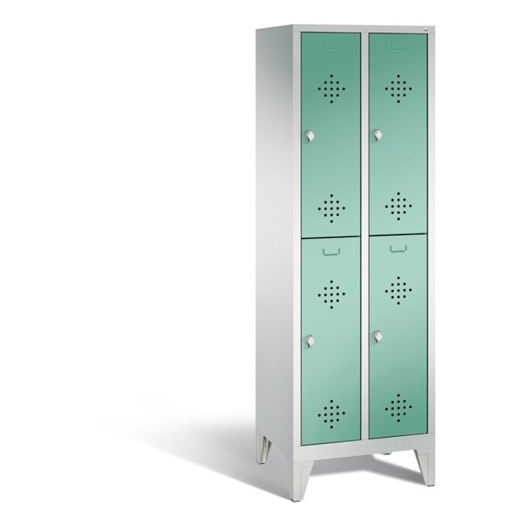 Doppelstöckiger Stahl-Garderobenschrank Classic, 2 Abteile mit je 2 Fächern, Abteilbreite 300 mm, Korpus aus stabiler Stahlkonstruktion mit hochwertiger Einbrennbeschichtung für hohe UV- und Korrosionsbeständigkeit, innen je Fach 1 stabile Garderobenstange aus Ovalprofil mit 3 verdrehsicheren Schiebehaken, auf 150 mm hohen Füßen, aus Kunststoff für optimalen Korrosionsschutz, 4 Drehriegel für Vorhängeschlösser, 4 Türen mit Anschlagsdämpfer und mittiger Verstärkung für hohe Stabilität, mit reinigungsfreundlichem Belüftungslochbild oben und unten sowie eingeprägtem Etikettenrahmen, Türaufhängung in Drehbolzen, Maße (H x B x T): 1850 x 610 x 500 mm, Korpus: RAL 7035 Lichtgrau, Türen Stahl: RAL 6027 Lichtgrün, Füße: RAL 7035 Lichtgrau