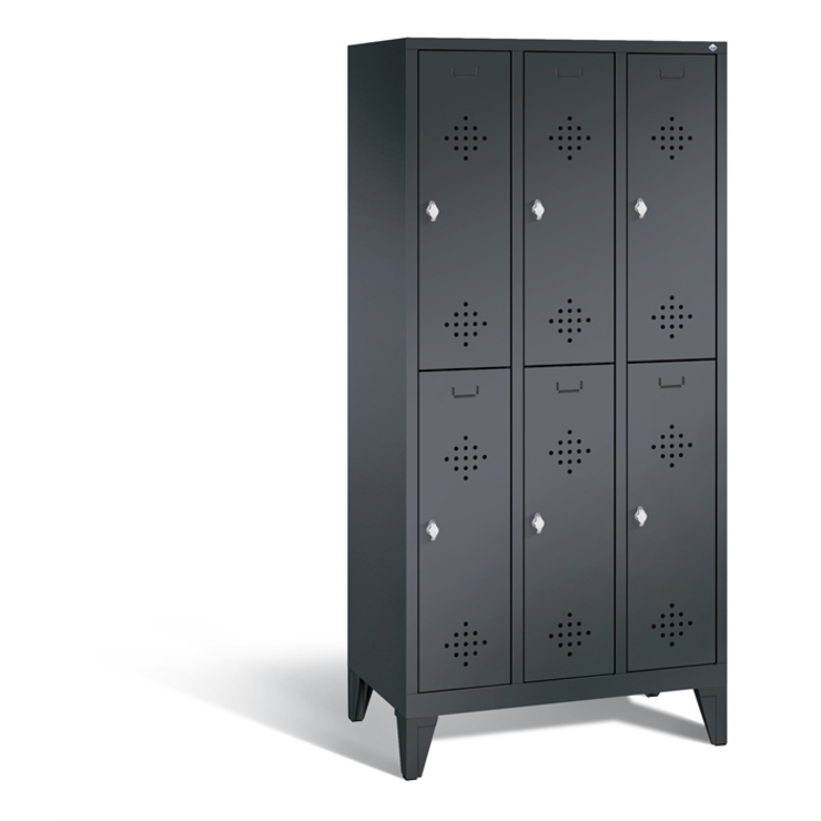 Doppelstöckiger Stahl-Garderobenschrank Classic, 3 Abteile mit je 2 Fächern, Abteilbreite 300 mm, Korpus aus stabiler Stahlkonstruktion mit hochwertiger Einbrennbeschichtung für hohe UV- und Korrosionsbeständigkeit, innen je Fach 1 stabile Garderobenstange aus Ovalprofil mit 3 verdrehsicheren Schiebehaken, auf 150 mm hohen Füßen, aus Kunststoff für optimalen Korrosionsschutz, 6 Drehriegel für Vorhängeschlösser, 6 Türen mit Anschlagsdämpfer und mittiger Verstärkung für hohe Stabilität, mit reinigungsfreundlichem Belüftungslochbild oben und unten sowie eingeprägtem Etikettenrahmen, Türaufhängung in Drehbolzen, Maße (H x B x T): 1850 x 900 x 500 mm, Korpus: RAL 7021 Schwarzgrau, Türen Stahl: RAL 7021 Schwarzgrau, Füße: RAL 9005 Tiefschwarz