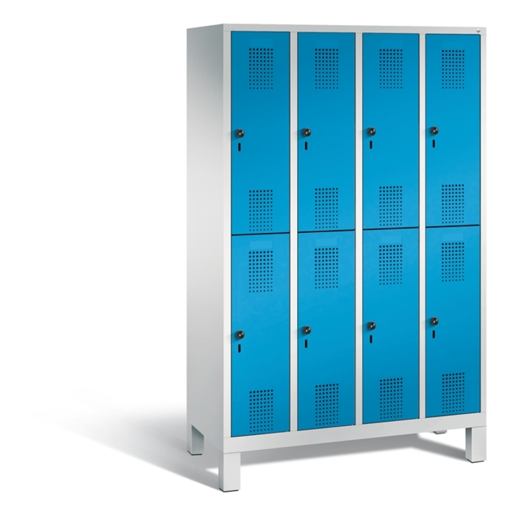 Doppelstöckiger Stahl-Garderobenschrank Evolo, 4 Abteile mit je 2 Fächern, Abteilbreite 300 mm, Korpus aus stabiler Stahlkonstruktion mit hochwertiger Einbrennbeschichtung für hohe UV- und Korrosionsbeständigkeit, innen je Fach 1 stabile Garderobenstange aus Ovalprofil mit 3 verdrehsicheren Schiebehaken, auf 150 mm hohen Füßen aus Kunststoff für erweiterten Korrosionsschutz, mit integrierter Niveauregulierung und Schutzhülsen zur stilvollen Abdeckung der Verstellschrauben, bequem von innen und außen verstellbar, 8 Ergonomische Sicherheits-Drehriegel für Vorhängeschlösser inkl. Tür-Schutz, Türen mit Anschlagsdämpfer und geschlossenen Seitenprofilen für höchste Stabilität und Einbruchsicherheit, mit reinigungsfreundlichem Belüftungslochbild oben und unten sowie eingeprägtem Etikettenrahmen, Türaufhängung in Drehbolzen, Maße (H x B x T): 1850 x 1190 x 500 mm, Korpus: RAL 7035 Lichtgrau, Türen Stahl: RAL 5012 Lichtblau, Füße: RAL 7035 Lichtgrau
