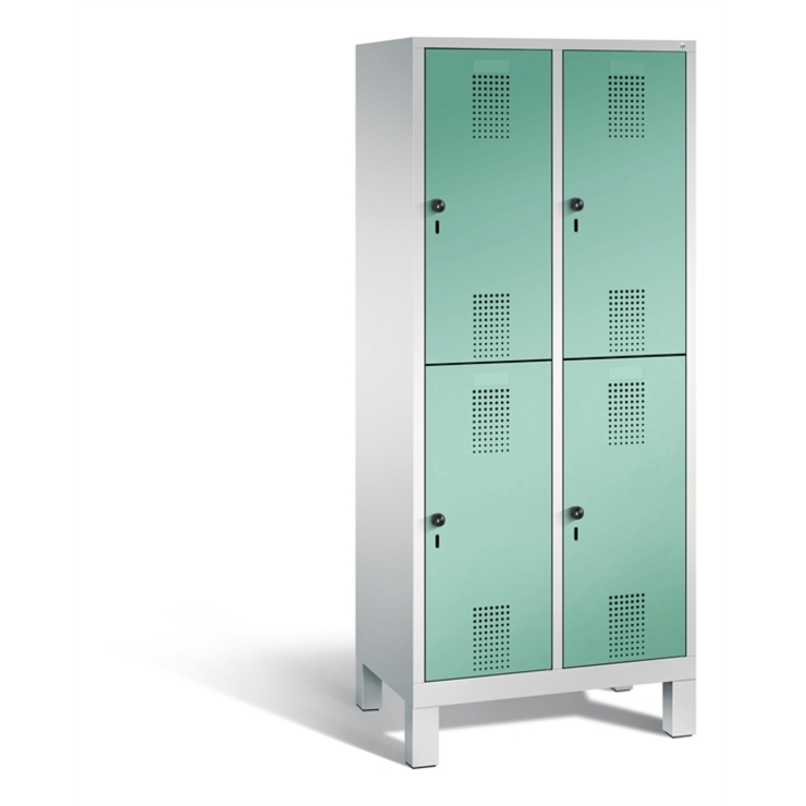 Doppelstöckiger Stahl-Garderobenschrank Evolo, 2 Abteile mit je 2 Fächern, Abteilbreite 400 mm, Korpus aus stabiler Stahlkonstruktion mit hochwertiger Einbrennbeschichtung für hohe UV- und Korrosionsbeständigkeit, innen je Fach 1 stabile Garderobenstange aus Ovalprofil mit 3 verdrehsicheren Schiebehaken, auf 150 mm hohen Füßen aus Kunststoff für erweiterten Korrosionsschutz, mit integrierter Niveauregulierung und Schutzhülsen zur stilvollen Abdeckung der Verstellschrauben, bequem von innen und außen verstellbar, 4 Ergonomische Sicherheits-Drehriegel für Vorhängeschlösser inkl. Tür-Schutz, Türen mit Anschlagsdämpfer und geschlossenen Seitenprofilen für höchste Stabilität und Einbruchsicherheit, mit reinigungsfreundlichem Belüftungslochbild oben und unten sowie eingeprägtem Etikettenrahmen, Türaufhängung in Drehbolzen, Maße (H x B x T): 1850 x 810 x 500 mm, Korpus: RAL 7035 Lichtgrau, Türen Stahl: RAL 6027 Lichtgrün, Füße: RAL 7035 Lichtgrau