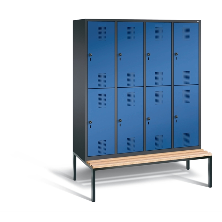 Doppelstöckiger Stahl-Garderobenschrank Evolo, 4 Abteile mit je 2 Fächern, Abteilbreite 400 mm, Korpus aus stabiler Stahlkonstruktion mit hochwertiger Einbrennbeschichtung für hohe UV- und Korrosionsbeständigkeit, innen je Fach 1 Ablageboden, darunter 1 stabile Garderobenstange aus Ovalprofil mit 3 verdrehsicheren Schiebehaken, auf untergebauter Sitzbank, Gestell aus stabilem Vierkant-Stahlrohr 30 x 30 mm, mit verstellbaren Bodengleitern für einfachen Niveauausgleich, 8 Ergonomische Sicherheits-Drehriegel für Vorhängeschlösser inkl. Tür-Schutz, Türen mit Anschlagsdämpfer und geschlossenen Seitenprofilen für höchste Stabilität und Einbruchsicherheit, mit reinigungsfreundlichem Belüftungslochbild oben und unten sowie eingeprägtem Etikettenrahmen, Türaufhängung in Drehbolzen, 1 Sitzleisten aus Buche-Hartholz, im Profil ca. 60 x 30 mm, allseitig gehobelt, oben abgerundet für guten Sitzkomfort, klarlackiert mit naturgegebenen Farbunterschieden, 1 Maße (H x B x T): 2090 x 1590 x 810 mm, Korpus: RAL 7021 Schwarzgrau, Türen Stahl: RAL 5010 Enzianblau, Gestell: RAL 7021 Schwarzgrau