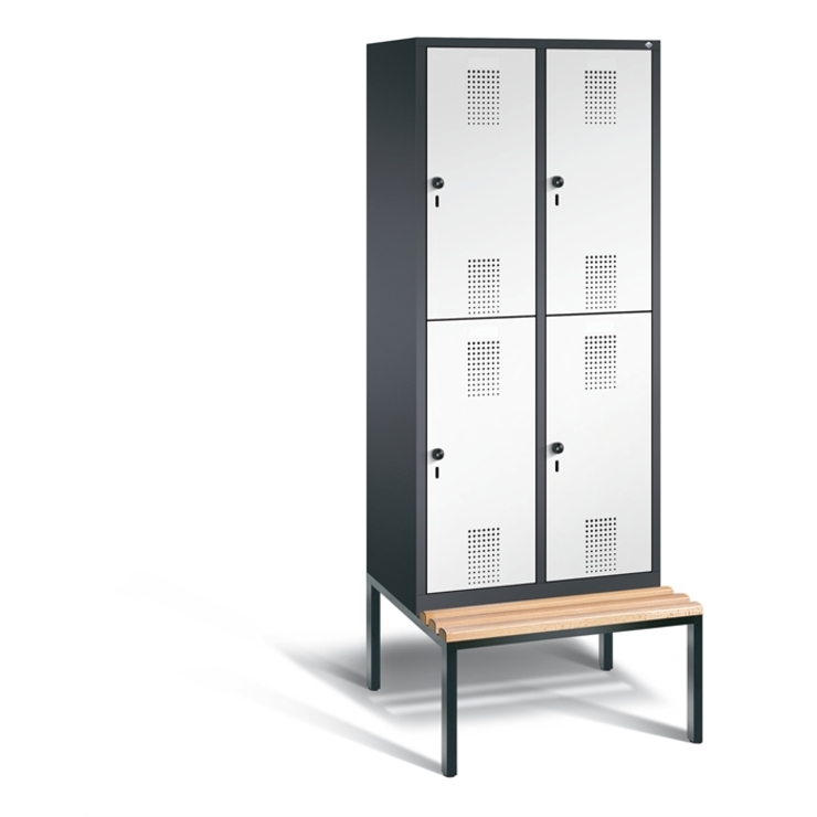 Doppelstöckiger Stahl-Garderobenschrank Evolo, 2 Abteile mit je 2 Fächern, Abteilbreite 400 mm, Korpus aus stabiler Stahlkonstruktion mit hochwertiger Einbrennbeschichtung für hohe UV- und Korrosionsbeständigkeit, innen je Fach 1 Ablageboden, darunter 1 stabile Garderobenstange aus Ovalprofil mit 3 verdrehsicheren Schiebehaken, auf untergebauter Sitzbank, Gestell aus stabilem Vierkant-Stahlrohr 30 x 30 mm, mit verstellbaren Bodengleitern für einfachen Niveauausgleich, 4 Ergonomische Sicherheits-Drehriegel für Vorhängeschlösser inkl. Tür-Schutz, Türen mit Anschlagsdämpfer und geschlossenen Seitenprofilen für höchste Stabilität und Einbruchsicherheit, mit reinigungsfreundlichem Belüftungslochbild oben und unten sowie eingeprägtem Etikettenrahmen, Türaufhängung in Drehbolzen, 1 Sitzleisten aus Buche-Hartholz, im Profil ca. 60 x 30 mm, allseitig gehobelt, oben abgerundet für guten Sitzkomfort, klarlackiert mit naturgegebenen Farbunterschieden, 1 Maße (H x B x T): 2090 x 810 x 815 mm, Korpus: RAL 7021 Schwarzgrau, Türen Stahl: RAL 9016 Verkehrsweiß, Gestell: RAL 7021 Schwarzgrau