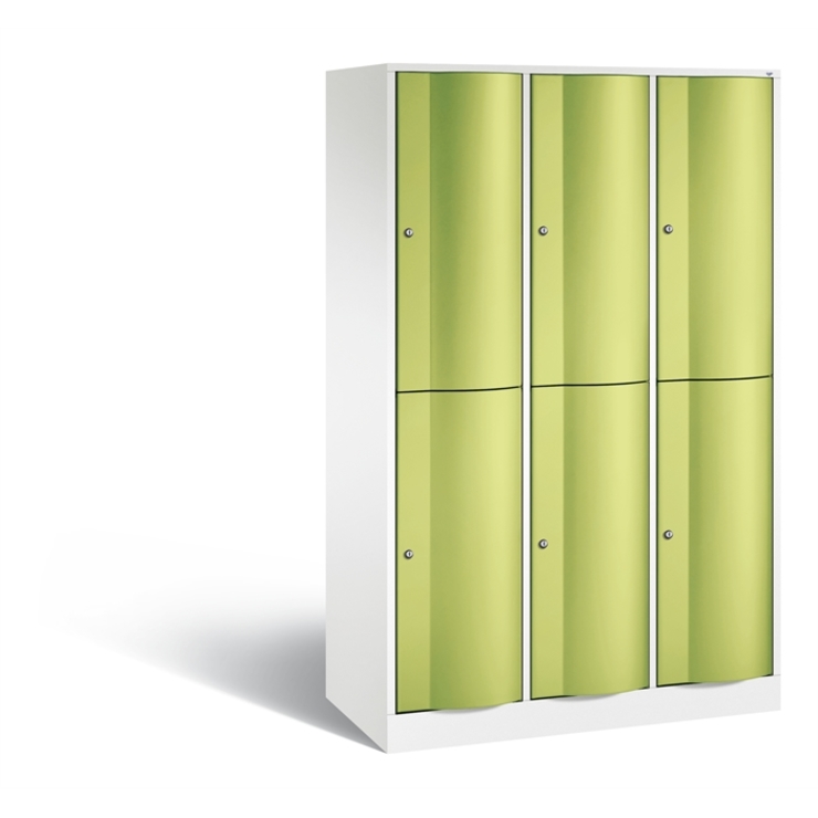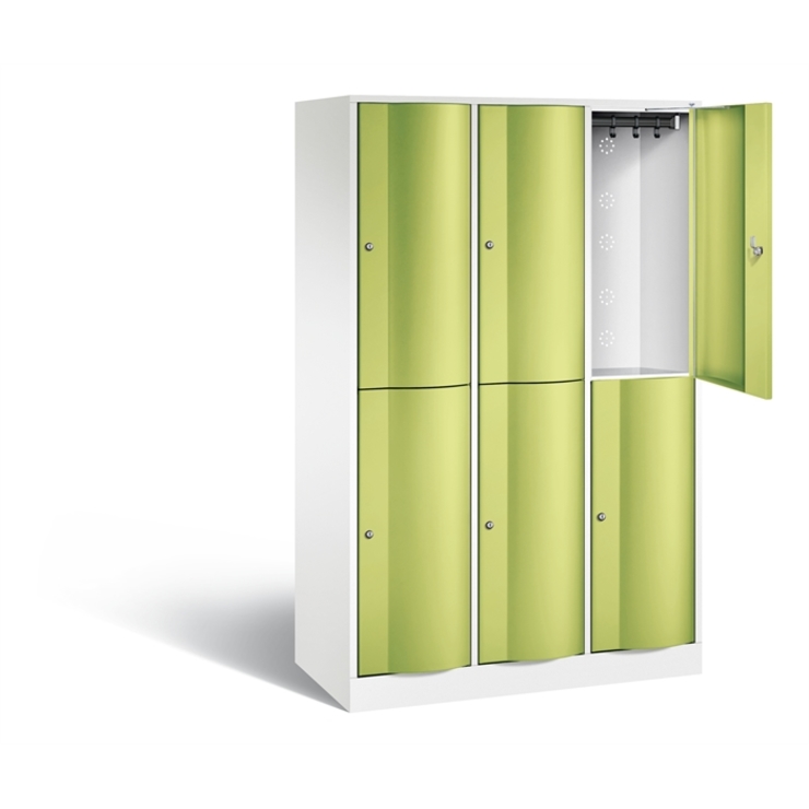 Doppelstöckiger Stahl-Garderobenschrank Resisto, 3 Abteile mit je 2 Fächern, Korpus aus stabiler Stahlkonstruktion mit hochwertiger Einbrennbeschichtung für hohe UV- und Korrosionsbeständigkeit, Spezialtüren aus 1,5 mm Stahl, mit Wölbung nach vorne, absolut stabil und vandalismussicher, mit Anschlagsdämpfer, Türaufhängung durchgängig mit robustem Drehstangen-Scharnier, rechts angeschlagen, innen je Fach 1 stabile Garderobenstange aus Ovalprofil mit 3 verdrehsicheren Schiebehaken, Rückwand mit großflächigem Luftdurchlass und 18 mm Wandabstandshaltern, auf 100 mm hohem Sockel mit 30 mm Niveauregulierung, 6 Drehzylinderschlösser mit 2 Schlüsseln, Schließkreis bis 6000 verschiedene Schließungen, Maße (H x B x T): 1950 x 1148 x 540 mm, Korpus: RAL 9016 Verkehrsweiß, Türen: 1108060 RDS Viridingrün