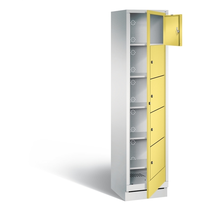 Stahl-Fächerschrank Classic, 2 Abteile mit 5 Fächern, Abteilbreite 400 mm, Korpus aus stabiler Stahlkonstruktion mit hochwertiger Einbrennbeschichtung für hohe UV- und Korrosionsbeständigkeit, auf 100 mm hohem Sockel, mit Kunststoffgleitern als praktischer Schrank- und Fußbodenschutz, vorne zurückgesetzt, 10 Zylinderschlösser mit je 2 Schlüsseln, Schließkreis bis 1000 verschiedene Schließungen, Türen mit Anschlagsdämpfer, Türaufhängung in Drehbolzen, Maße (H x B x T): 1800 x 810 x 500... (mehr)? Papersmart hilft Ihnen, den besten Anbieter für Ihren gesamten Warenkorb zu ermitteln.