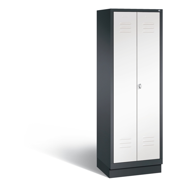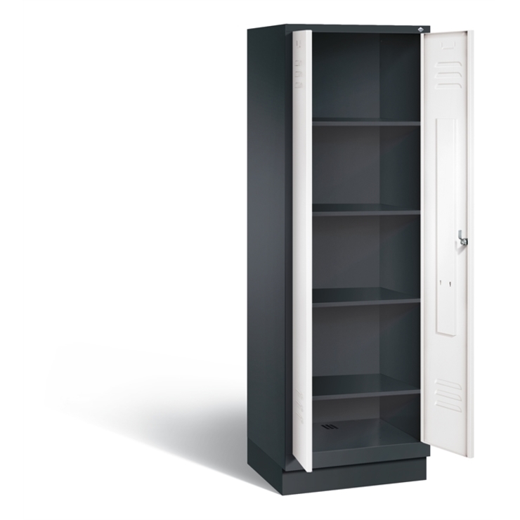 Stahl-Garderobenschrank Classic, als Wäsche- und Aufbewahrungsschrank, Korpus aus stabiler Stahlkonstruktion mit hochwertiger Einbrennbeschichtung für hohe UV- und Korrosionsbeständigkeit, Türen zueinanderschlagend für gemeinsamen Verschluss, innen 4 Ablageböden, Schrankboden hinten mit Lüftungsöffnungen für optimale Luftzirkulation, auf 100 mm hohem Sockel, mit Kunststoffgleitern als praktischer Schrank- und Fußbodenschutz, vorne zurückgesetzt und oberhalb mit Luftdurchlass, 1 Drehriegel für Vorhangschloss, Türen mit Anschlagsdämpfer und mittiger Verstärkung für hohe Stabilität, mit Lüftungschlitzen oben und unten sowie eingestanztem Etikettenrahmen, Türaufhängung in Drehbolzen, Maße (H x B x T): 1800 x 610 x 500 mm, Korpus: RAL 7021 Schwarzgrau, Türen Stahl: RAL 9016 Verkehrsweiß, Inneneinrichtung: RAL 7021 Schwarzgrau