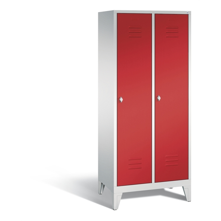 Stahl-Garderobenschrank Classic, als Mehrzweckschrank, 2 Abteile, Abteilbreite 400 mm, Korpus aus stabiler Stahlkonstruktion mit hochwertiger Einbrennbeschichtung für hohe UV- und Korrosionsbeständigkeit, innen 4 fest eingebaute Einlegeböden je Abteil, Schrankboden hinten mit Lüftungsöffnungen für optimale Luftzirkulation, auf 150 mm hohen Füßen aus Kunststoff für erweiterten Korrosionsschutz, 2 Drehriegel für Vorhängeschlösser, Türen mit Anschlagsdämpfer und mittiger Verstärkung für hohe Stabilität, mit Lüftungschlitzen oben und unten sowie eingestanztem Etikettenrahmen, Türaufhängung in Drehbolzen, Maße (H x B x T): 1850 x 810 x 500 mm, Korpus: RAL 7035 Lichtgrau, Türen Stahl: RAL 3000 feuerrot, Inneneinrichtung: RAL 7035 Lichtgrau, Füße: RAL 7035 Lichtgrau