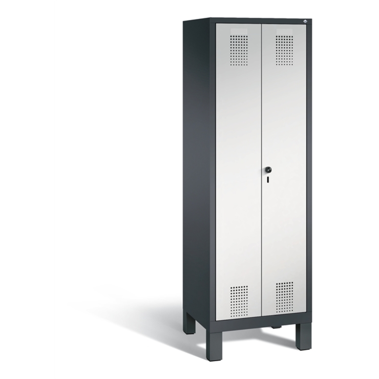 Stahl-Garderobenschrank Evolo, als Mehrzweckschrank, Korpus aus stabiler Stahlkonstruktion mit hochwertiger Einbrennbeschichtung für hohe UV- und Korrosionsbeständigkeit, Türen zueinanderschlagend für gemeinsamen Verschluss, innen mit Mitteltrennwand, je Abteil 4 Einlegeböden, Schrankboden hinten mit Belüftungsöffnungen, auf 150 mm hohen Füßen aus Kunststoff für erweiterten Korrosionsschutz, mit integrierter Niveauregulierung und Schutzhülsen zur stilvollen Abdeckung der Verstellschrauben, bequem von innen und außen verstellbar, 1 Ergonomischer Sicherheits-Drehriegel für Vorhangschloss inkl. Tür-Schutz, Türen mit Anschlagsdämpfer und geschlossenen Seitenprofilen für höchste Stabilität und Einbruchsicherheit, mit reinigungsfreundlichem Belüftungslochbild oben und unten sowie eingeprägtem Etikettenrahmen, Türaufhängung in Drehbolzen, Maße (H x B x T): 1850 x 610 x 500 mm, Korpus: RAL 7021 Schwarzgrau, Türen Stahl: RAL 7035 Lichtgrau, Füße: RAL 9005 Tiefschwarz, Inneneinrichtung: RAL 7021 Schwarzgrau