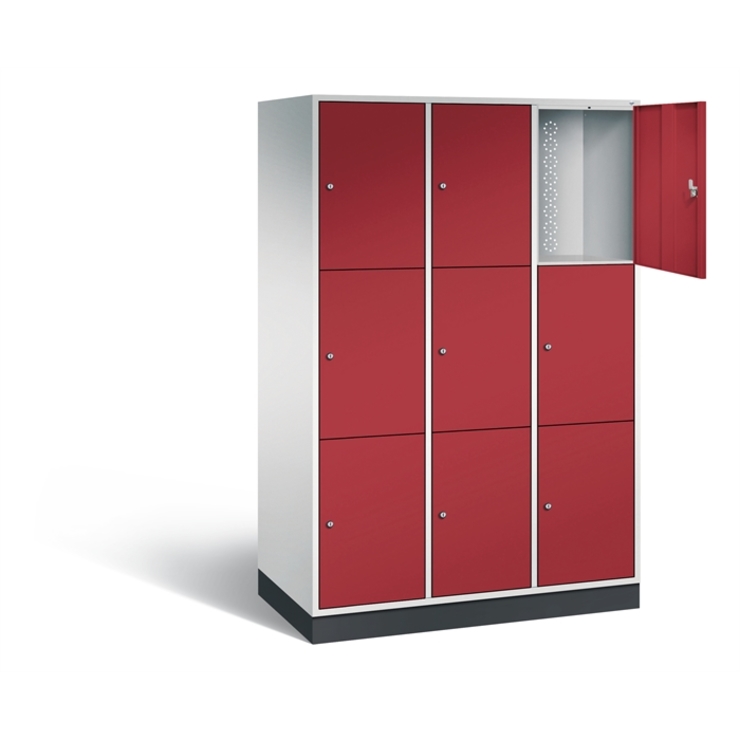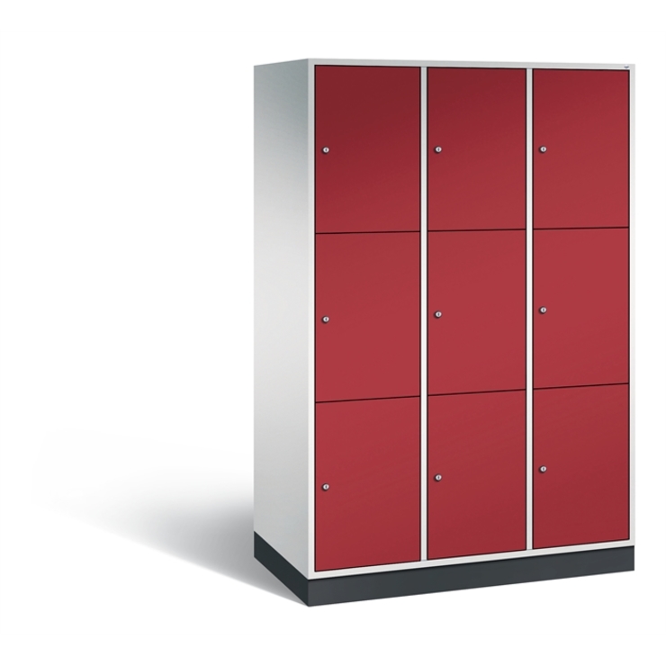 Stahl-Schließfachschrank Intro, XL, 3 Abteile mit 3 Fächern, Abteilbreite 400 mm, Korpus aus stabiler Stahlkonstruktion mit hochwertiger Einbrennbeschichtung für hohe UV- und Korrosionsbeständigkeit, Türen verstärkt für hohe Stabilität, mit Anschlagsdämpfer, Türaufhängung durchgängig mit robustem Scharnierband, rechts angeschlagen, Rückwand mit großflächigem Luftdurchlass und 18 mm Wandabstandshaltern, auf 100 mm hohem Sockel, 9 Zylinderschlösser mit je 2 Schlüsseln, Schließkreis bis 1000 verschiedene Schließungen, Maße (H x B x T): 1950 x 1220 x 590 mm, Korpus: RAL 7035 Lichtgrau, Türen: RAL 3003 Rubinrot, Sockel: RAL 7021 Schwarzgrau