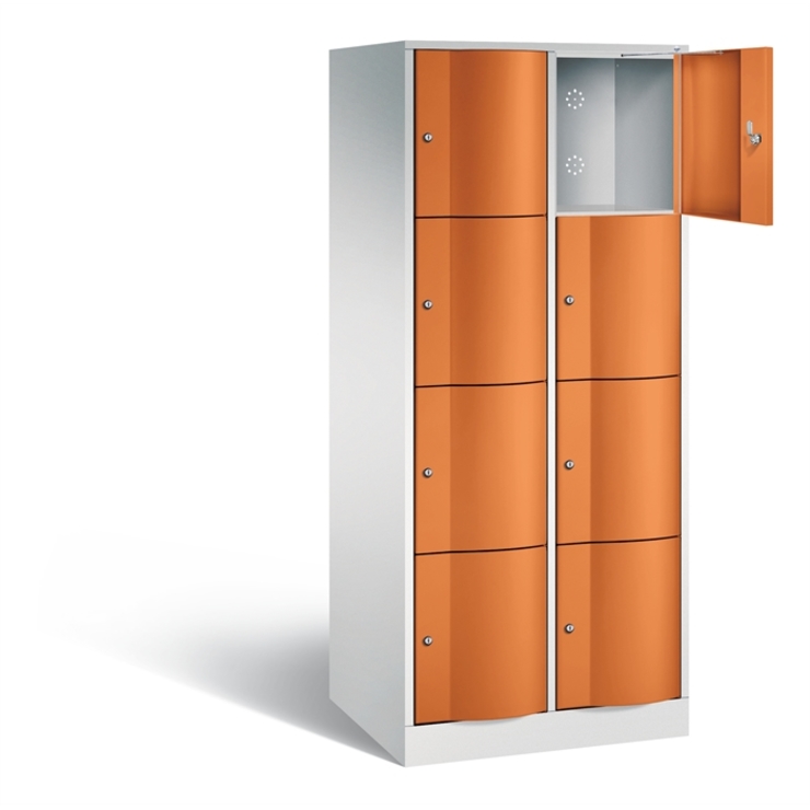 Stahl-Schließfachschrank Resisto, XL, 2 Abteile mit je 4 Fächern, Korpus aus stabiler Stahlkonstruktion mit hochwertiger Einbrennbeschichtung für hohe UV- und Korrosionsbeständigkeit, Spezialtüren aus 1,5 mm Stahl, mit Wölbung nach vorne, absolut stabil und vandalismussicher, mit Anschlagsdämpfer, Türaufhängung durchgängig mit robustem Drehstangen- Scharnier, rechts angeschlagen, Rückwand mit großflächigem Luftdurchlass und 18 mm Wandabstandshaltern, auf 100 mm hohem Sockel mit 30 mm Niveauregulierung, 8 Drehzylinderschlösser mit 2 Schlüsseln, Schließkreis bis 6000 verschiedene Schließungen, Maße (H x B x T): 1950 x 772 x 640 mm, Korpus: RAL 7035 Lichtgrau, Türen: RAL 2000 Gelborange