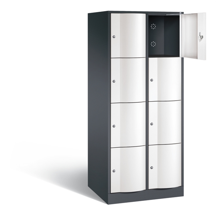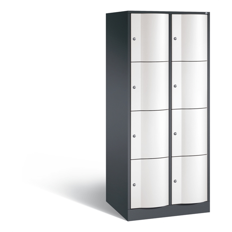 Stahl-Schließfachschrank Resisto, XL, 2 Abteile mit je 4 Fächern, Korpus aus stabiler Stahlkonstruktion mit hochwertiger Einbrennbeschichtung für hohe UV- und Korrosionsbeständigkeit, Spezialtüren aus 1,5 mm Stahl, mit Wölbung nach vorne, absolut stabil und vandalismussicher, mit Anschlagsdämpfer, Türaufhängung durchgängig mit robustem Drehstangen- Scharnier, rechts angeschlagen, Rückwand mit großflächigem Luftdurchlass und 18 mm Wandabstandshaltern, auf 100 mm hohem Sockel mit 30 mm Niveauregulierung, 8 Drehzylinderschlösser mit 2 Schlüsseln, Schließkreis bis 6000 verschiedene Schließungen, Maße (H x B x T): 1950 x 772 x 640 mm, Korpus: RAL 7021 Schwarzgrau, Türen: RAL 9016 Verkehrsweiß