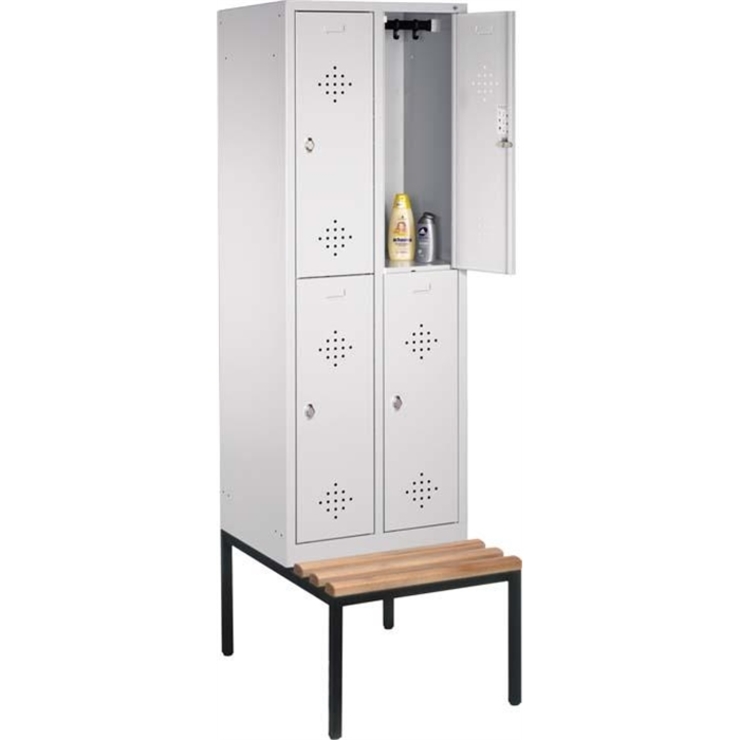 Doppelstöckiger Garderobenschrank Serie Classic mit untergebauter Sitzbank, Höhe 2090 mm, lichtgrau/enzianblau • Langlebige Stahlblechkonstruktion Schränke mit 2 Fächern übereinander. Erhöhter Korrosionsschutz durch Schrankfüße aus Kunststoff. • Praktische Türen Rechts angeschlagen, in Drehbolzen gelagert, oben und unten mit je 1 Lochrosette und 1 eingestanztem Etikettenrahmen. Mit Drehriegelverschluss zur Verwendung eines Vorhängeschlosses. • Durchdachtes Innenkonzept Abteilbreite 400 mm, auf für Motorradhelme geeignet. Kleiderstange mit 3 Schiebehaken für jedes Abteil. Leichte Reinigung, glatt auskehrbarer Abteilboden. • Große Farbauswahl Korpus: RAL 7035 lichtgrau, Türen: RAL 7035 lichtgrau Korpus: RAL 7035 lichtgrau, Türen: RAL 5010 enzianblau Korpus: RAL 7035 lichtgrau, Türen: RAL 5012 lichtblau Weitere Farben auf Anfrage erhältlich. Böden und Fächer generell in Korpusfarbe ausgeführt. • Sitzbank: Sitzlatten aus Buche, ca. 60 x 35 mm, klarlackiert mit naturgegebenen Farbunterschieden. Sitztiefe: 315 mm. Gesamttiefe: 815 mm. Untergestell in RAL 7021 anthrazitgrau, Bodengleiter mit 10 mm Niveuausgleich. Lieferung erfolgt getrennt vom Schrank zur einfachen Selbstmontage. Abb. zeigt mögliche Farbkombination Korpus RAL 7035/Türen RAL 5010
