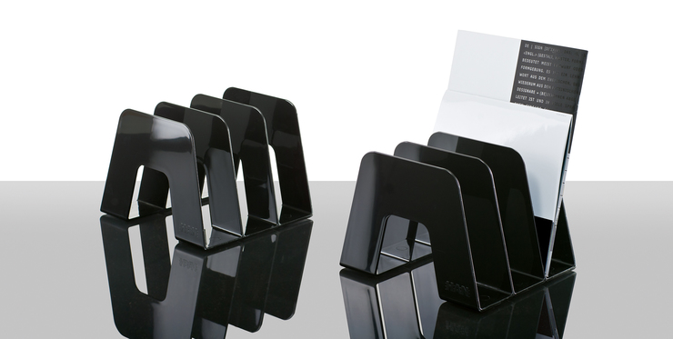 Katalogsammler SORTER für Formate bis DIN A4 / C4. Praktischer Katalogsammler für eine Vielzahl von Zeitschriften, Broschüren und Prospekten. Elegante Optik, hochglänzende Oberfläche und moderne, klare Linienführung bringen Glanz in das designorientierte Büro. Ideal für den Büro- und Privatbereich. 3 Fächerunterteilungen mit jeweils einer Breite von 65 mm. Rutschfeste, möbelschonende Gummifüße sorgen für einen sicheren Stand. Fassungsvermögen: 3 x 65 mm. Made in Germany. Außenmaße: (B x T x H): 209 x 224 x 163 mm. Material: hochwertiger Kunststoff, Polystyrol (PS). Farbe: schwarz.