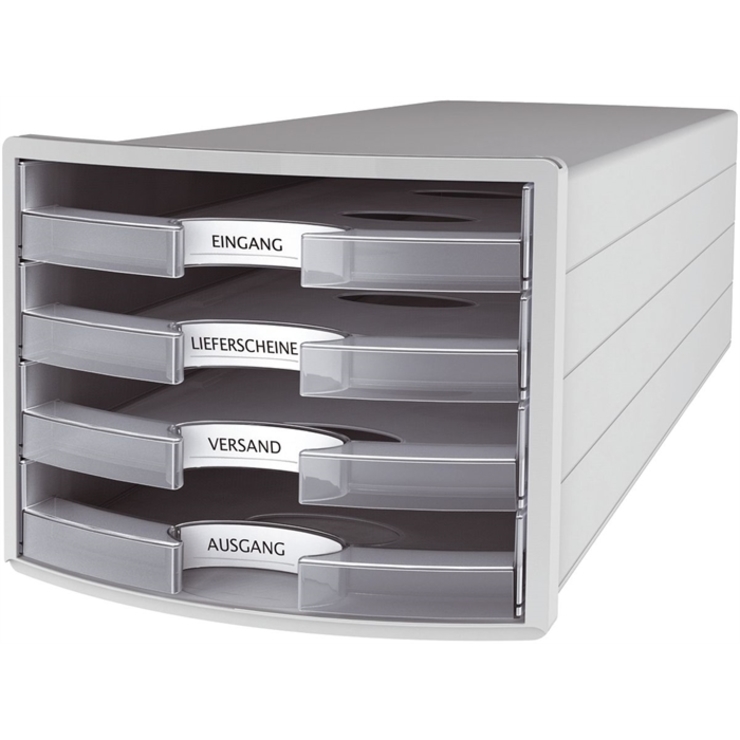 HAN Schubladenbox IMPULS 2.0, Polystyrol, mit 4 offenen Schubladen, A4/C4, 294 x 368 x 235 mm, lichtgrau/farblos, transluzent