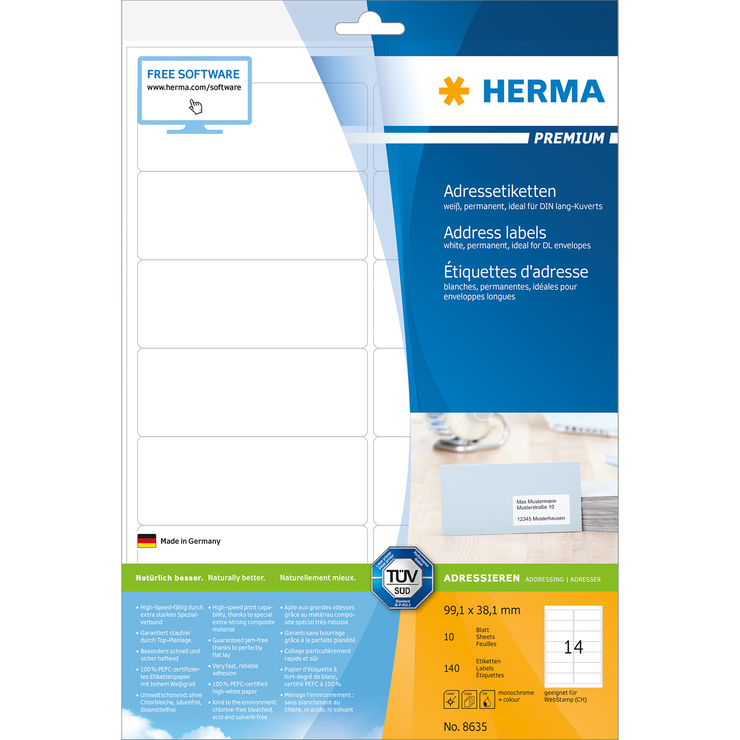 Selbstklebende Etiketten auf A4-Blättern, permanent haftend. Perfekt für alle Laser- und Inkjetdrucker, Kopierer, Farblaserdrucker und Farbkopierer. Hoher Weißgrad und gleichmäßige Oberfläche für beste Druckergebnisse in Schwarz und Farbe. Spürbar dicker: extra starke Etiketten - einfaches Aufkleben. Besonders schnell und sicher haftend, auch auf kühlen und feuchten Oberflächen. Garantiert staufrei und high-speed-fähig durch extra starken Spezialverbund, Top-Planlage und Rundum-Sicherheitskante. Umweltschonend und nachhaltig: chlorfrei gebleicht, PEFC-zertifiziert, lösemittelfreier Haftkleber. Etiketten sind 100 % recyclingfähig mit dem Altpapier, Verpackung aus Recyclingkarton. Kostenlose Softwarelösungen: www.herma.de / software.