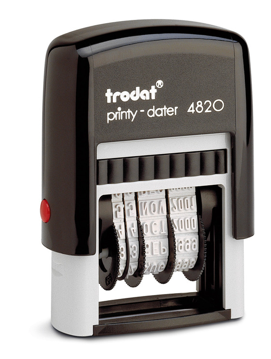 TRODAT Datumstempel, selbstfärbend. Printy Dater 4820. Abdruckgröße: 4 x 25 mm, Monate in Buchstaben, Schrifthöhe 4,0 mm. Kunststoffgehäuse mit offen zugänglichen Gummibändern, Kunststoffräder zum Verstellen des Datums. Mit integriertem Stempelkissen in Schwarz. Stempelgröße: 7,0 x 3,1 x 9,9 cm. In SB-Verpackung.